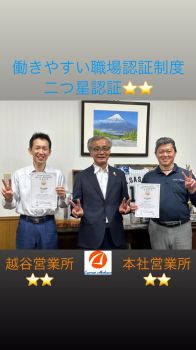#働きやすい職場認証制度 #二つ星認証 #本社 #越谷営業所 #運転者職場環境良好度