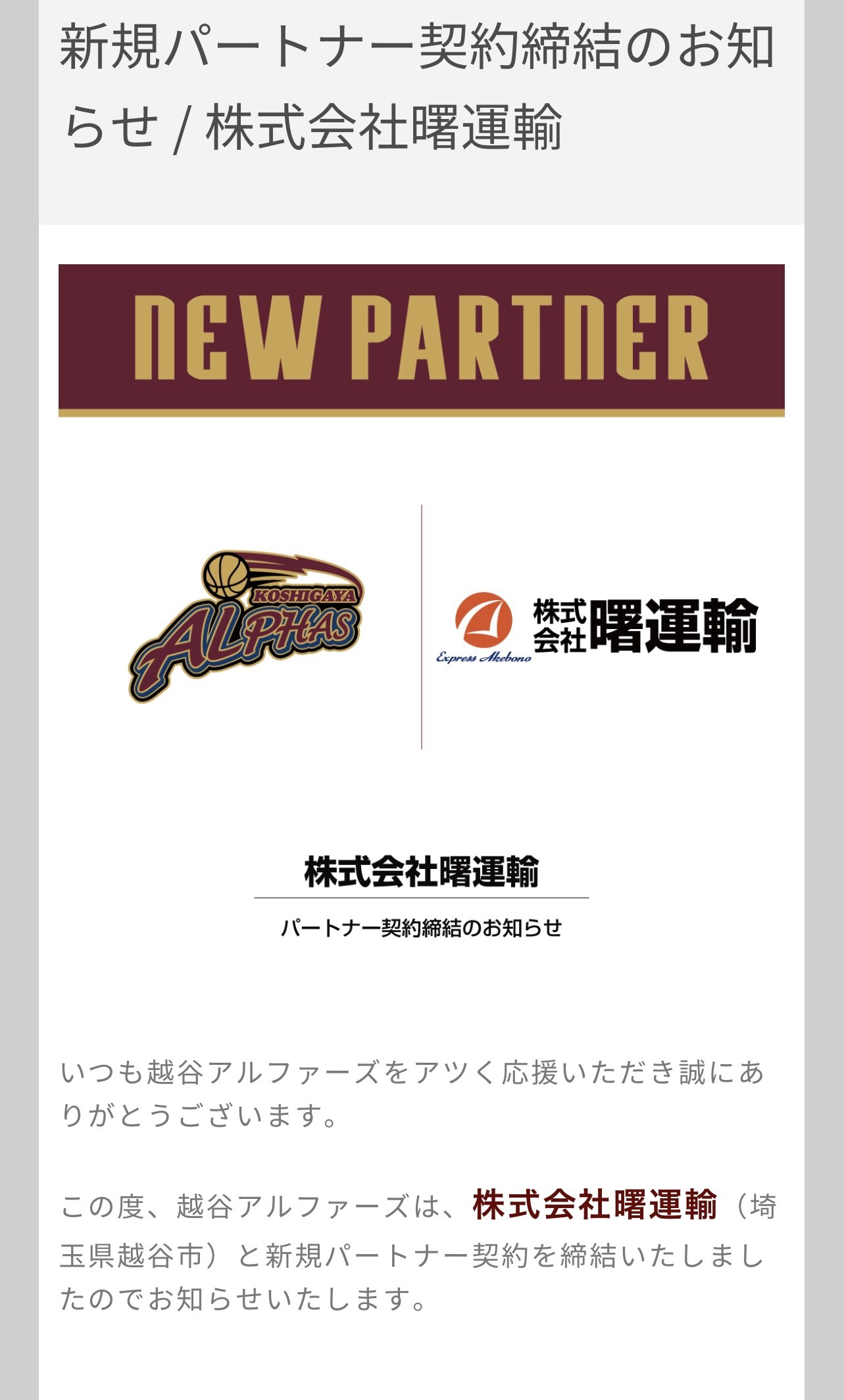 #男子プロバスケットボールリーグ #越谷アルファーズ #パートナー契約 #Bリーグ #地域活性